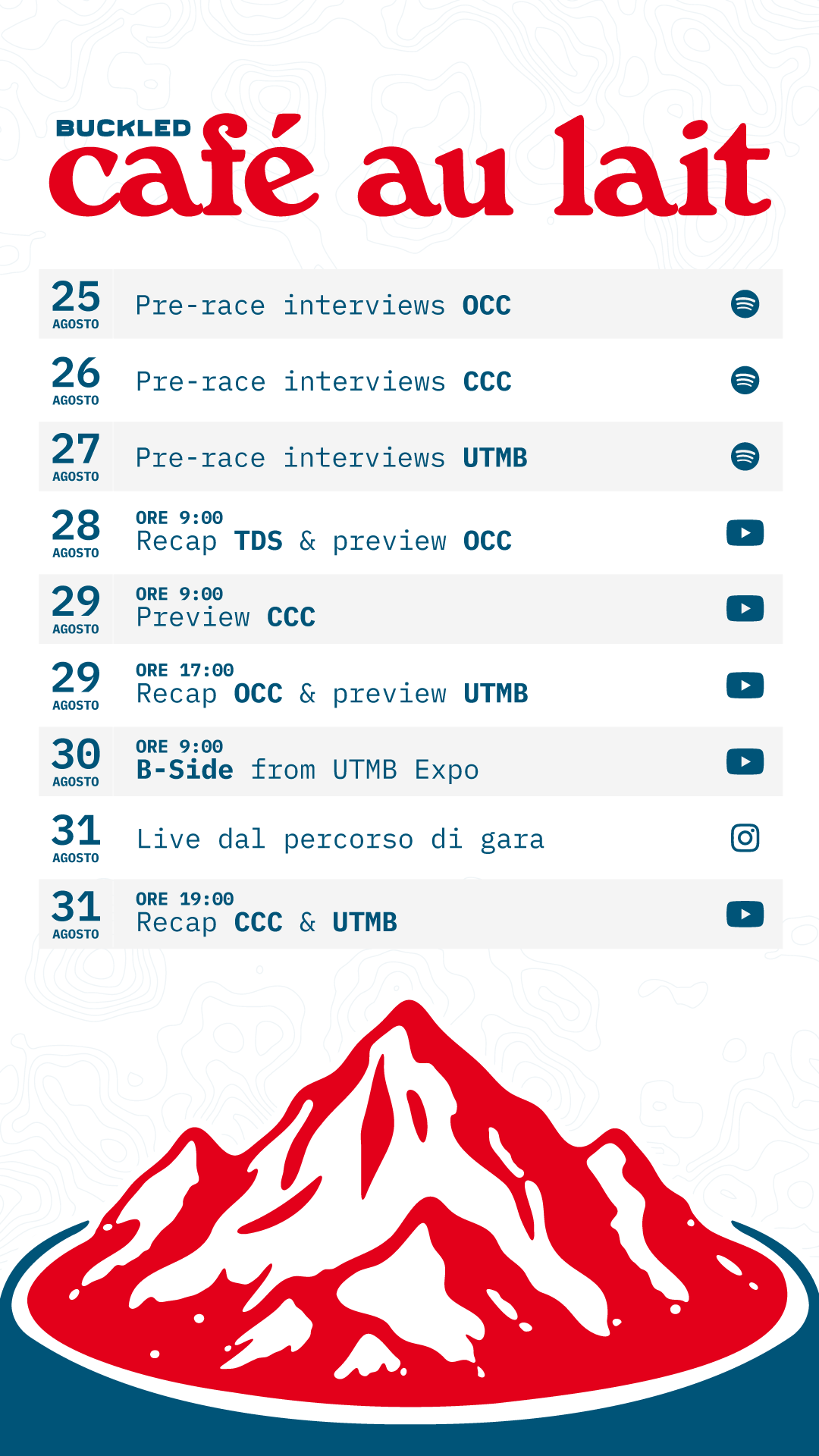 E allora, anche in terra savoiarda, ci sta la Shakeout Run rituale. Quest’anno partiamo dalla zona pic-nic davanti all’Ospedale di Chamonix: un po’perché vogliamo portarvi alle Casacade du Dard, un po’ perché post corsa potrebbe esserci una bella sorpresa con gli amici di Buckled (say no more). A proposito, avete bene in mente il loro programma per la settimana UTMB? No? Meglio ripassare allora… “Café au lait” per tutti!