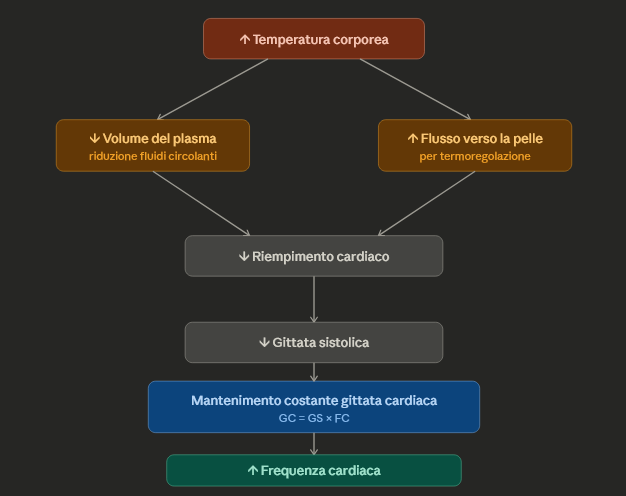 Un altro contributo plausibile è legato a una ridistribuzione del flusso sanguigno dalle aree periferiche ai muscoli in attività, con un meccanismo specularmente inverso a quello osservato prima per la termoregolazione. Infine, la diminuzione della frequenza cardiaca al di sotto dei valori iniziali potrebbe essere spiegata in parte dai normali cambiamenti legati al ritmo circadiano, in particolare se analizziamo i dati di gare che si svolgono nelle ore notturne.